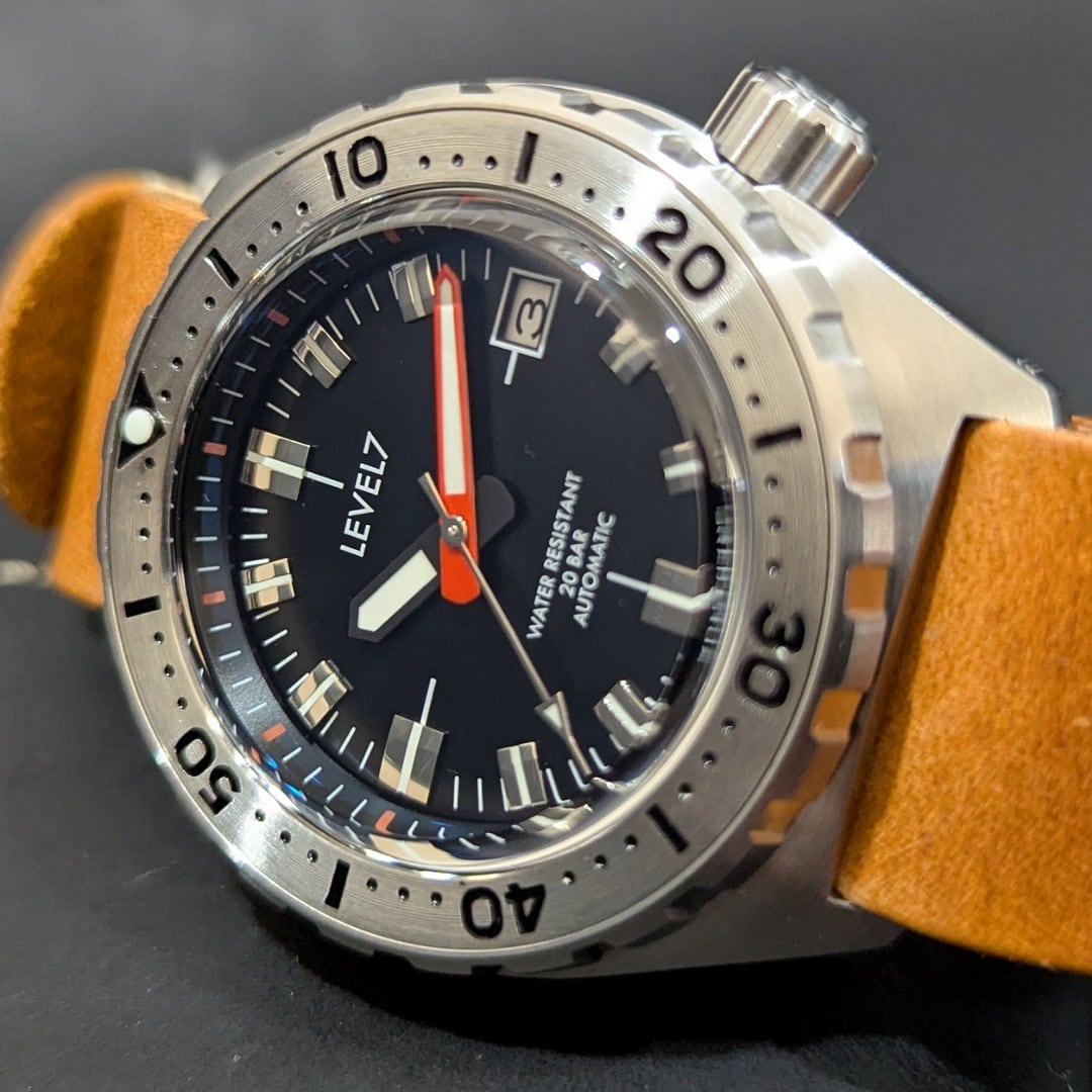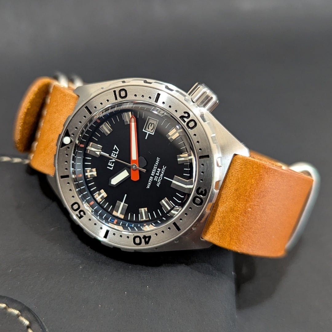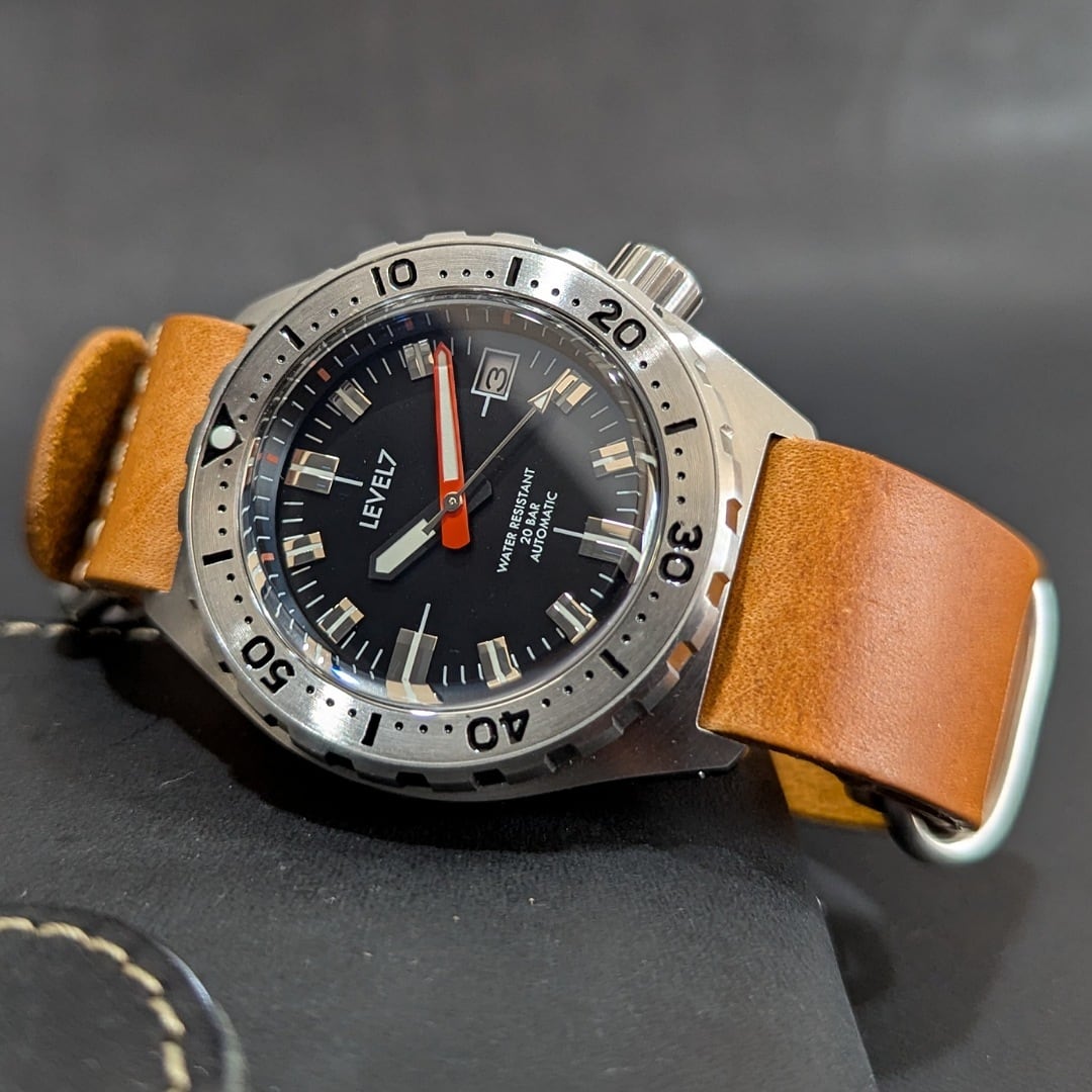 【LV1】【X1FBK-3S-LZ】【TOPハット G003】フラットベゼル 20気圧防水 機械式/自動巻き SEIKO NH35 ムーブメント搭載 ハンドメイドZULUレザーベルト メンズウォッチ LV1-ver2 LEVEL7