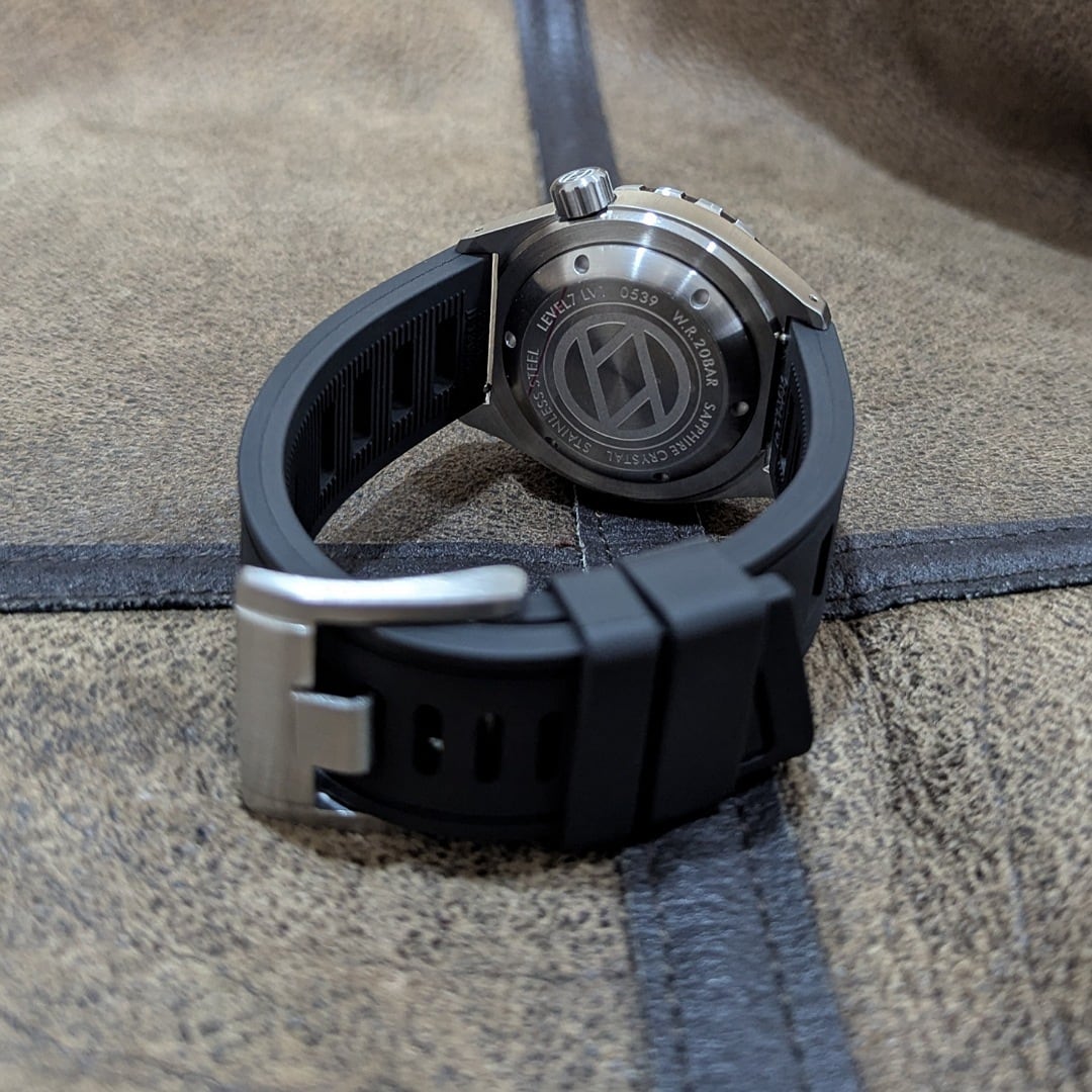 ケースには、酸化に強く、低アレルギーな金属、医療器具などに使用される316Lサージカルステンレス、風防は、傷に強い硬度9を誇るサファイアクリスタルを採用し、視野性を確保するため、ARコーティングを施したコダワリ。 耐水、防水性は、20気圧を確保。 蓄光(ベゼル、ハンズ、インデックス)には、薄暗い時、暗い時、どんな時でも、光を放ちあなたに時間を示してくれる発光度の高いルミナスを採用。 腕時計の心臓部でもあるムーブメントは、日本が誇るセイコーホールディングスの子会社、セイコーウォッチ(SII/TMI)の自動巻きムーブメント(NH36/NH36A)を採用しています。
