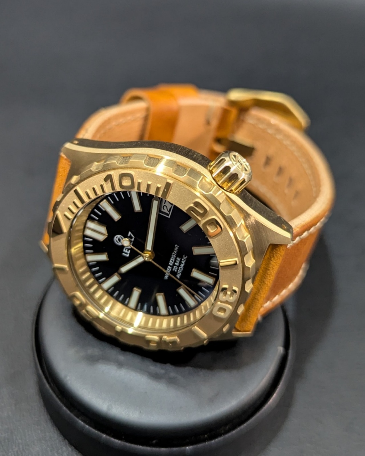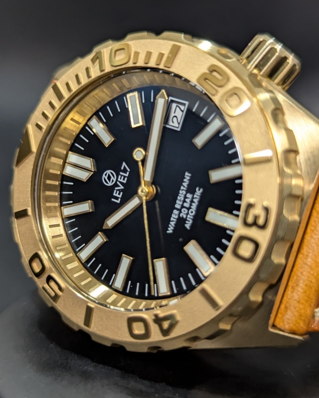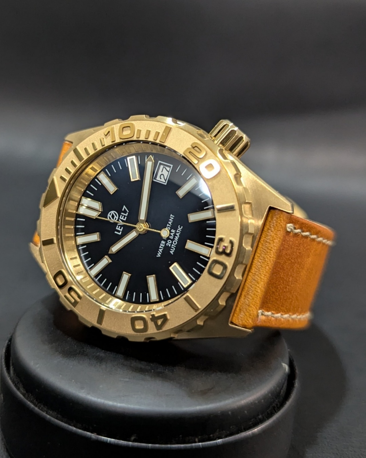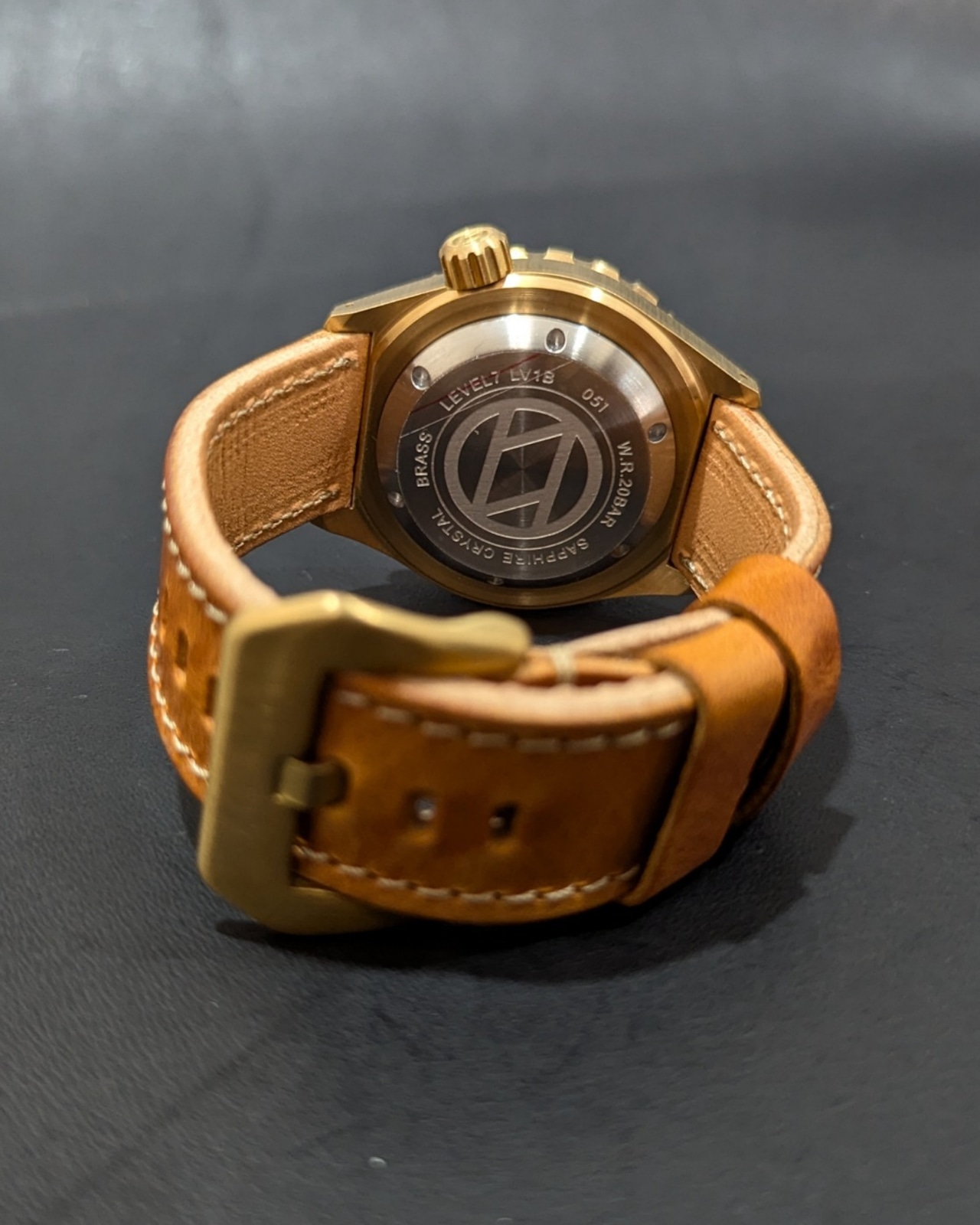 【LV1-BRASS】【2NDFBK-2GD02-2PW】【G002/ダブルドーム風防】 【スロープ型ベゼル】 ブラスケース ハンドメイドレザーベルト ブラックダイアル 20気圧防水 機械式/自動巻き SEIKO NH35 ムーブメント搭載 メンズウォッチ LEVEL7