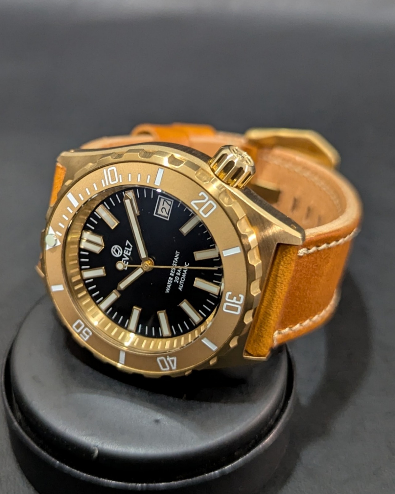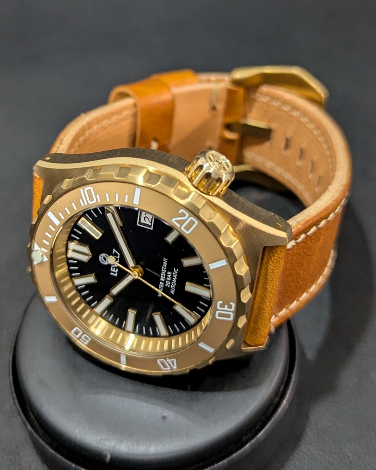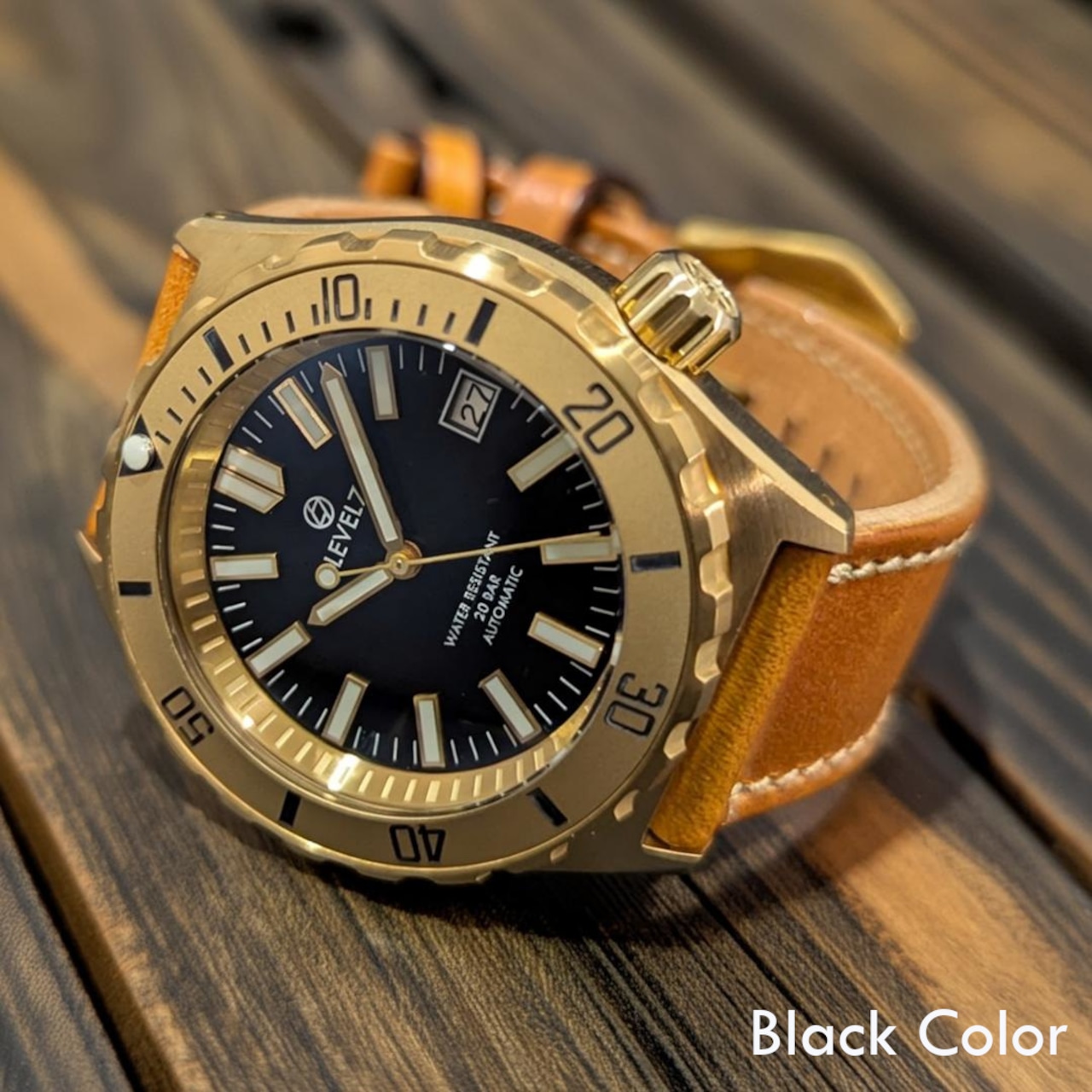 【LV1-BRASS】【2NDFBK-2GD-2PW】【G003/ダブルドーム風防】 【スロープ型ベゼル】 ブラスケース ハンドメイドレザーベルト ブラックダイアル 20気圧防水 機械式/自動巻き SEIKO NH35 ムーブメント搭載 メンズウォッチ LEVEL7