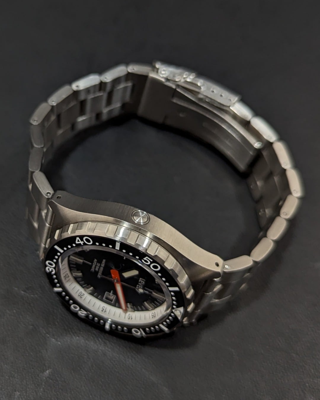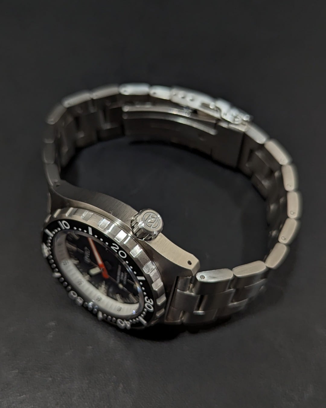 ver2ケースは、高気圧防水(50気圧)の耐水性を兼ね備え、飽和潜水用のヘリウムエスケープバルブを9時位置の側面部に装備した本格派のメンズウォッチになります。