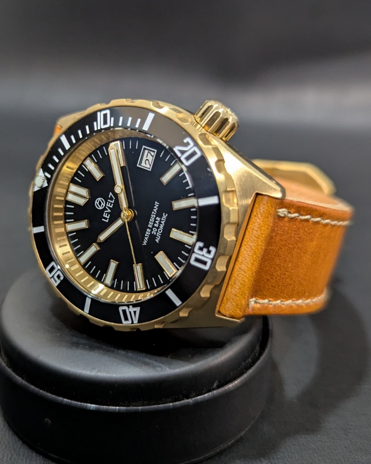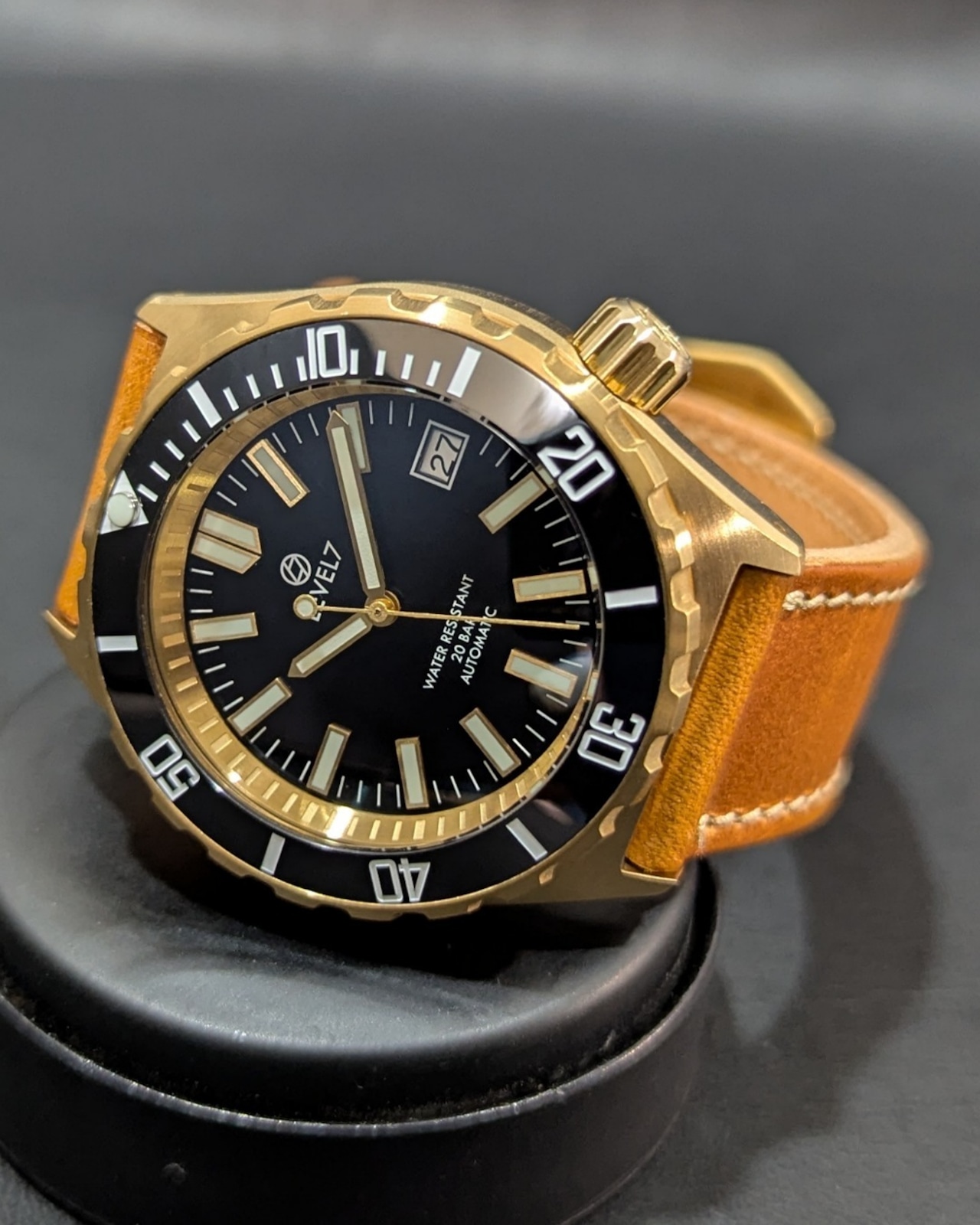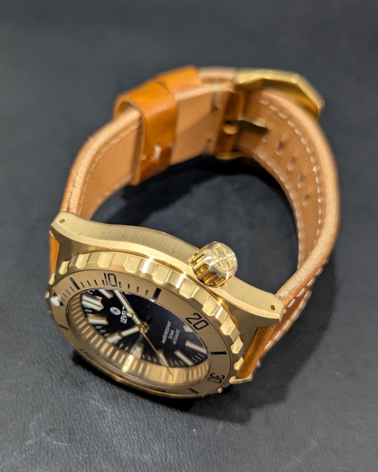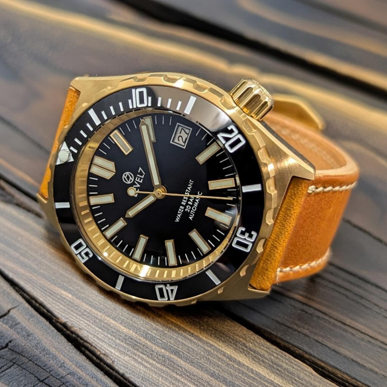 【LV1-BRASS】【2NDFBK-2GD-2PW】【G002/ダブルドーム風防】 【スロープ型ベゼル】 ブラスケース ハンドメイドレザーベルト ブラックダイアル 20気圧防水 機械式/自動巻き SEIKO NH35 ムーブメント搭載 メンズウォッチ LEVEL7