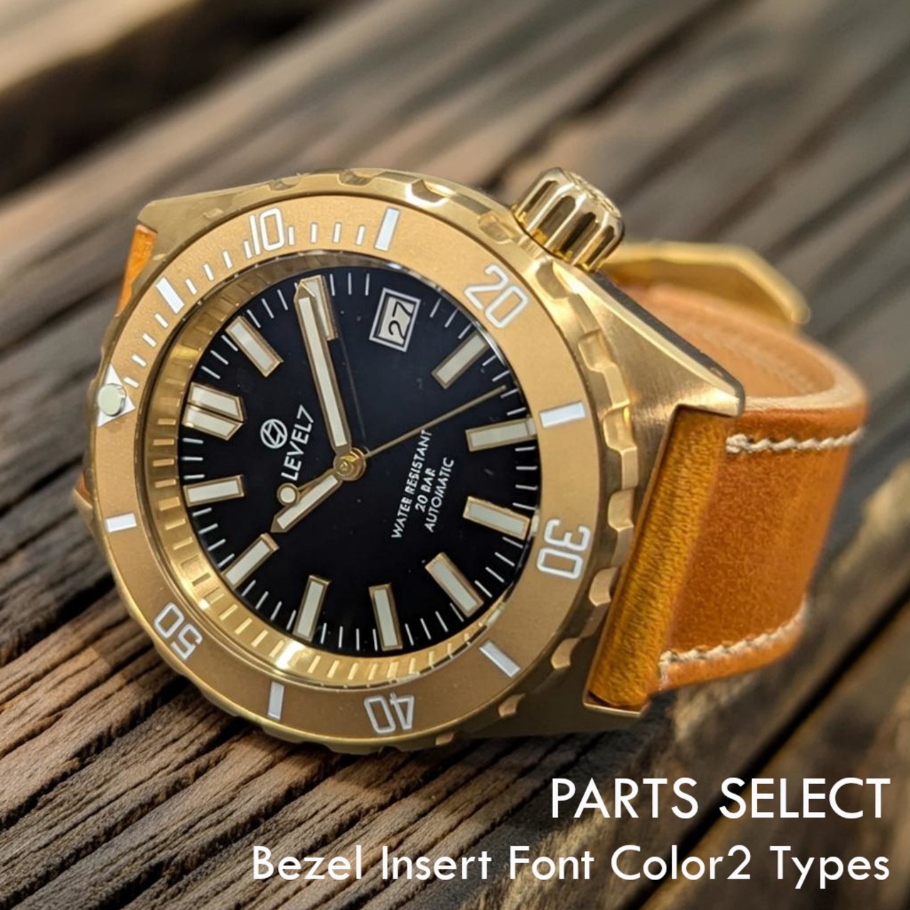 【LV1-BRASS】【2NDFBK-2GD-2PW】【G002/ダブルドーム風防】 【スロープ型ベゼル】 ブラスケース ハンドメイドレザーベルト ブラックダイアル 20気圧防水 機械式/自動巻き SEIKO NH35 ムーブメント搭載 メンズウォッチ LEVEL7