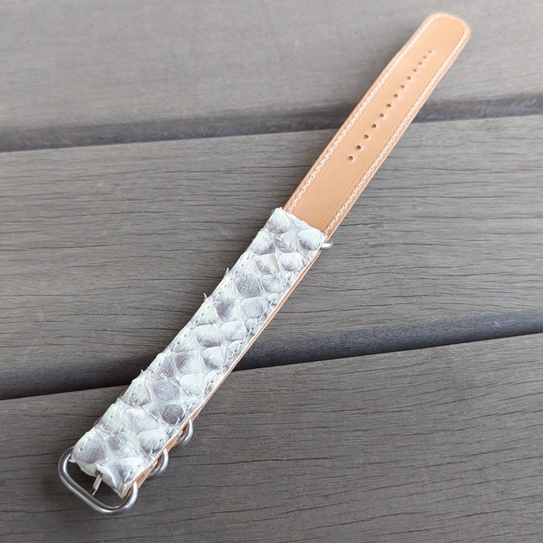 本革ダイヤモンドパイソン、マット仕立てナチュラルスキンに、下地、オイル仕立ての生成りのヌメ革を使用した腕時計用ZULUベルト。