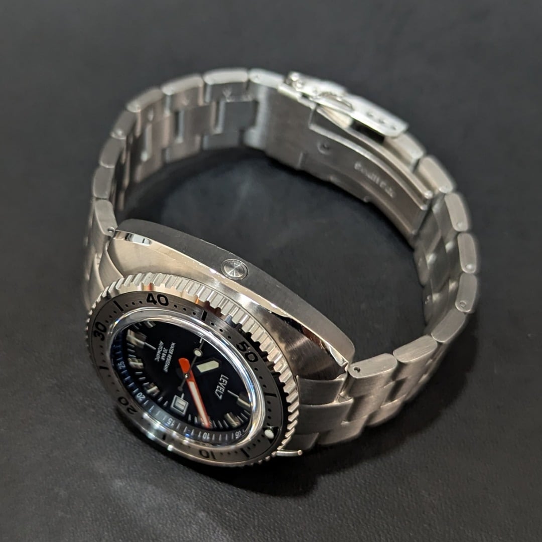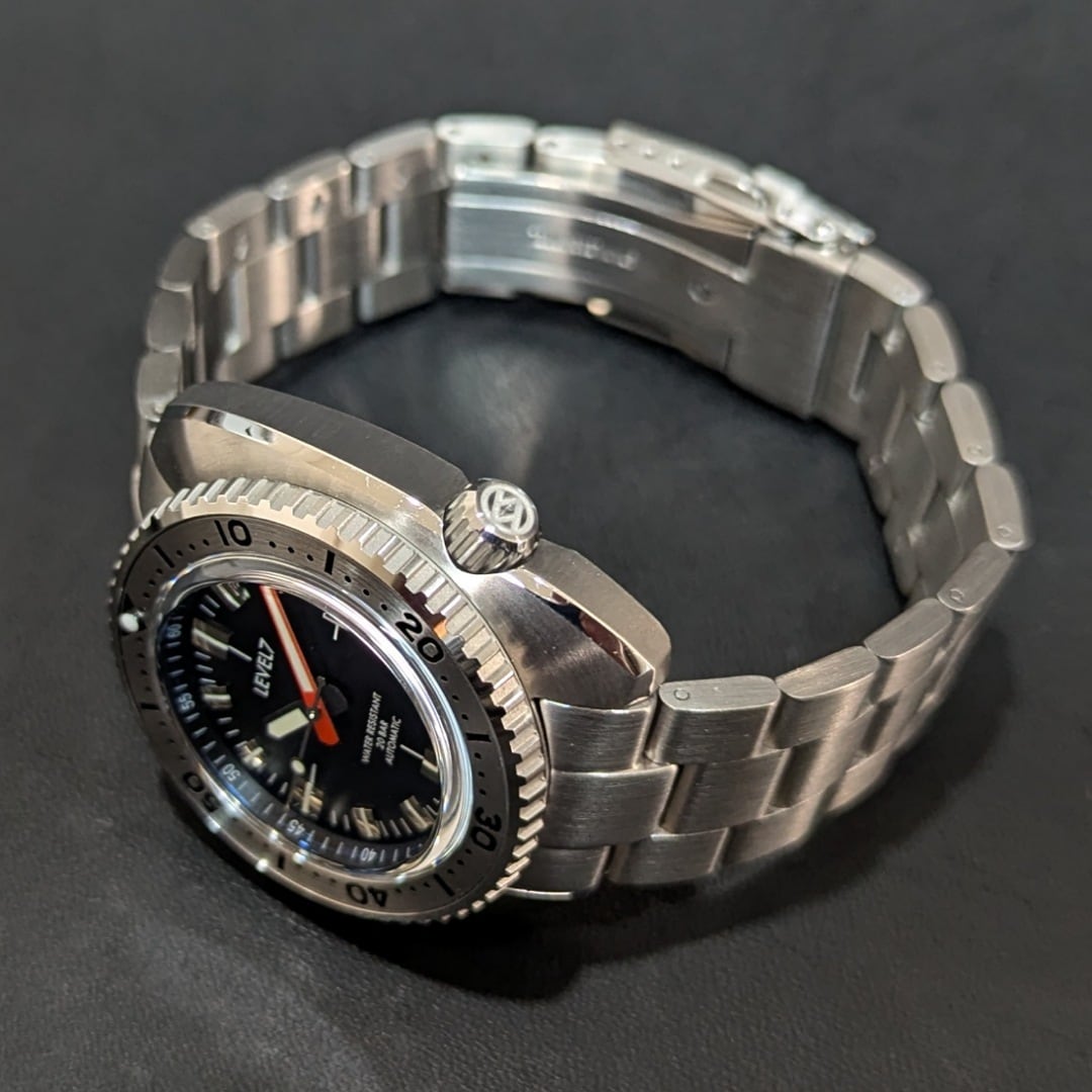 LV1-ver2同様、高気圧防水(50気圧)の耐水性を兼ね備え、飽和潜水用のヘリウムエスケープバルブを9時位置の側面部に装備した本格派のメンズウォッチになります。