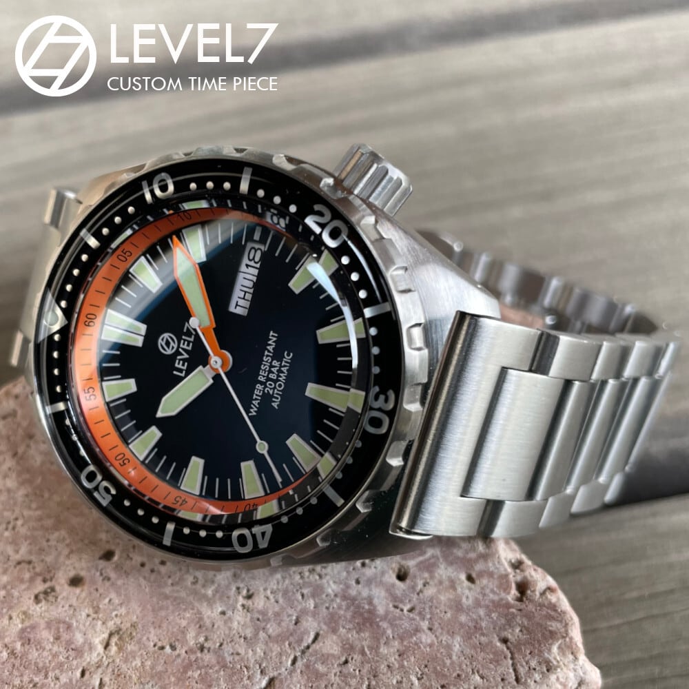 【LV1】【C3S-ORBKEP】ブラック×オレンジ 20気圧防水 機械式/自動巻き SEIKO NH36A ムーブメント搭載 サファイアダブルドーム風防 無垢ステンレスバンド メンズウォッチ LV1-ver2 LEVEL7